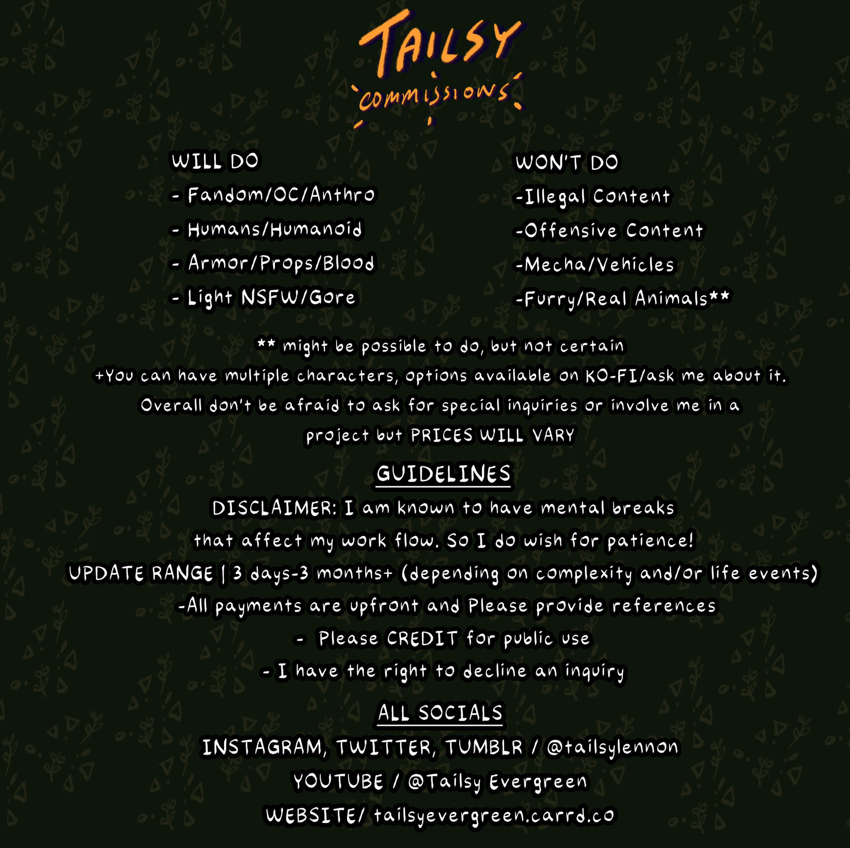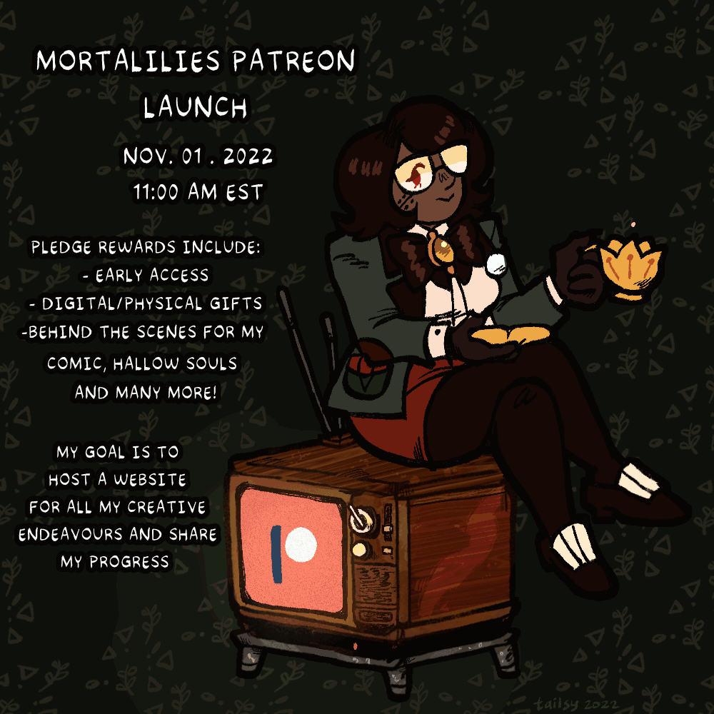 Mor-ta-LiliesMortalilies is a grand hub for all creation by Tailsy Evergreen. Here you will find webcomics, projects, think pieces and other miscellaneous things that Tailsy is into.Her biggest projects she wants to work on are "Hallow Souls", "Divine Curiosity”, "Pass the Light" to name a few so thank you for indulging in this little corner on the internet.Why the name?I personally question my reality a lot and what it means to be alive. Morbid I know but it's the truth.I wanted to intergrate two of my biggest things into something enjoyable for myself and hopefully others. Honestly the website in itself is an experiment, plus I love web design back in the early 2000s and personal websites, it's a dream.At the end of the day this is all in good fun for myself but I always want to seek improvement.